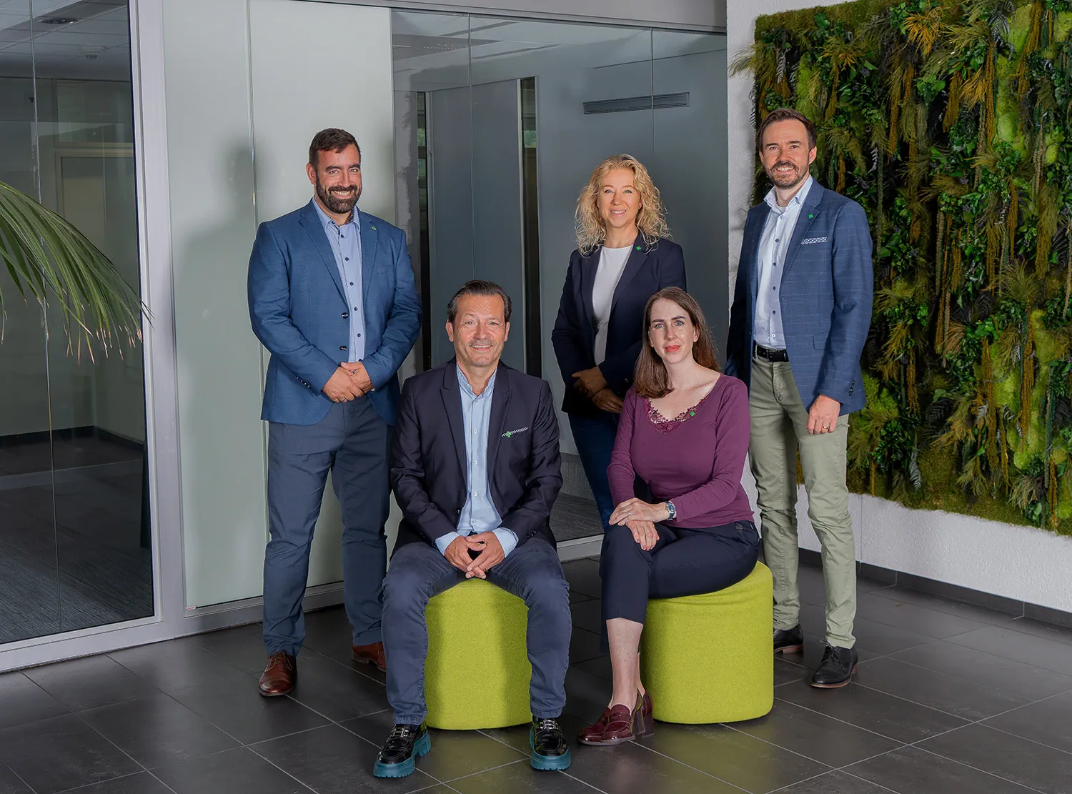 Auf dem Foto sehen Sie hinten von links nach rechts: Benjamin Kuoni, Abteilungsleiter Bildung, Stéphanie Logassi Kury, Abteilungsleiterin Kommunikation, Dr. Stephen Jenkinson, Abteilungsleiter Innovationen. In der Reihe vorne sehen Sie von links nach rechts: Sven Leisi, Generalsekretär und Andrea Küffer, Abteilungsleiterin Tarife, Digitalisierung und Qualität.